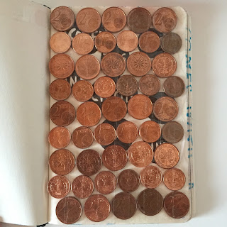 Ennél a feladatnál az oldalt olyan körökkel kellett beborítani, amit találtunk. Az ötlet nem saját, de nagyon megtetszett, így megcsináltam. Itthon elég sok egy és két centes van félretéve, azokat ragaszgattam be egyesével. Igen, egyesével. De azért szerintem megérte, viszont a könyv is nehezebb lett egy kicsit. :D